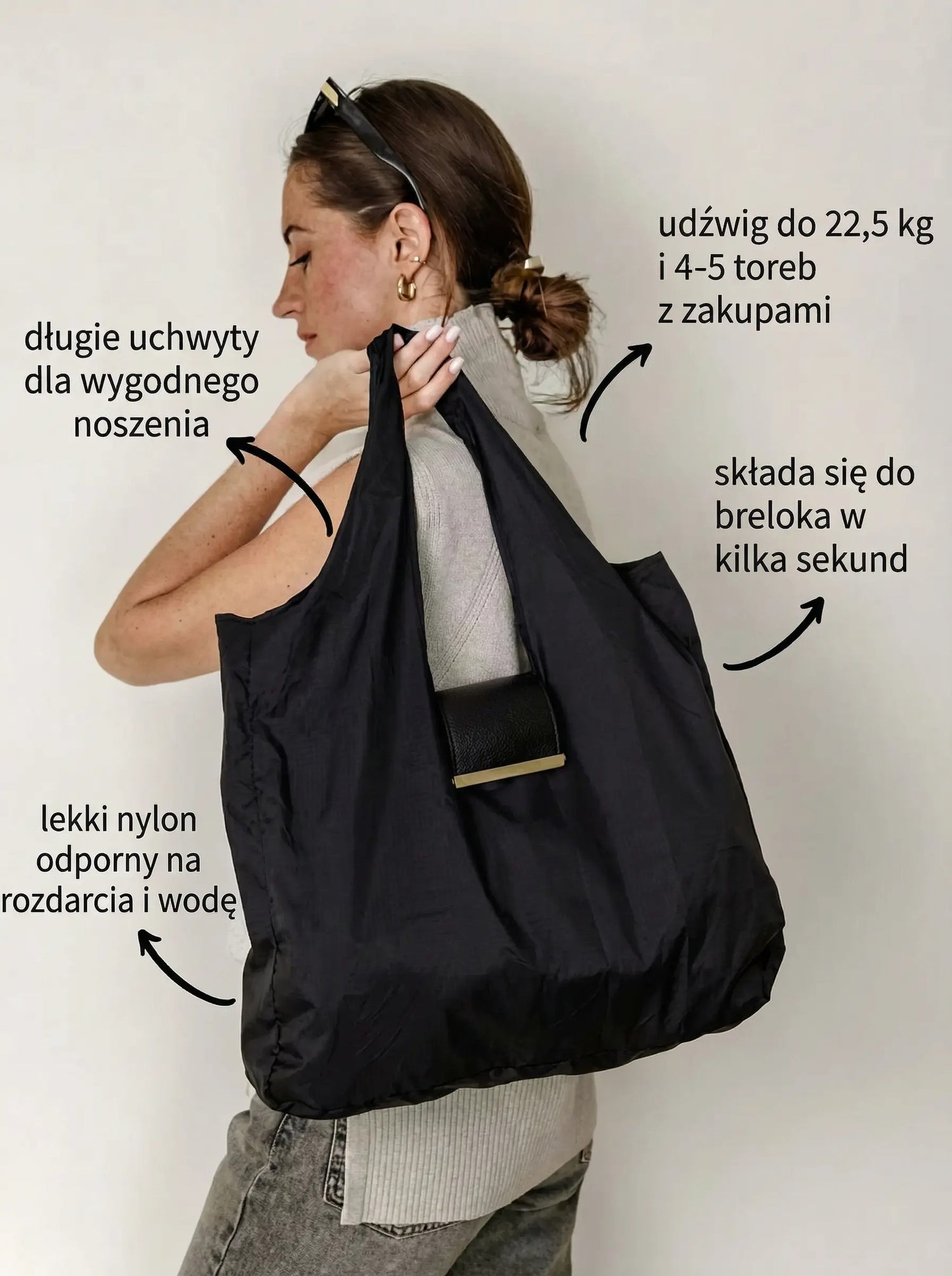 Absolutnie nie! Torba została zaprojektowana tak, abyś mogła ją złożyć i schować w zaledwie kilka sekund.